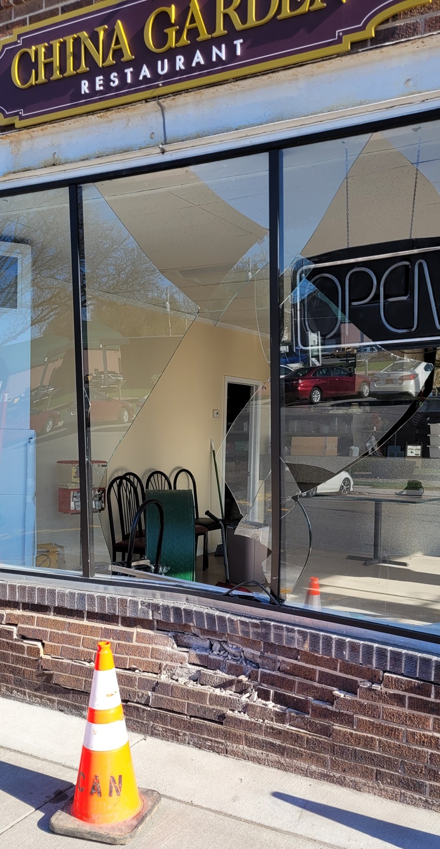 Damage to the restaurant includes broken glass, a caved-in window frame, and a smashed brick exterior. Police do not believe anyone was injured, and there were no witnesses. The damage was not discovered until a passerby called police later that morning.
