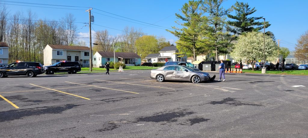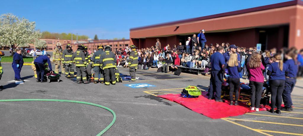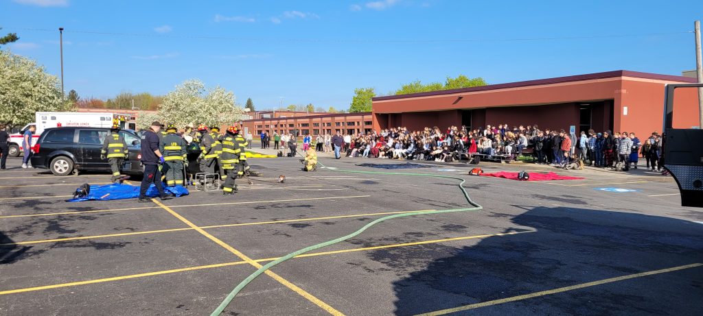 CANASTOTA, NY – With prom season just around the corner, several local emergency response agencies gathered at the Canastota Jr./Sr. High School Thursday morning to perform a mock car crash and educate teenagers about the dangers of drunk and distracted driving.