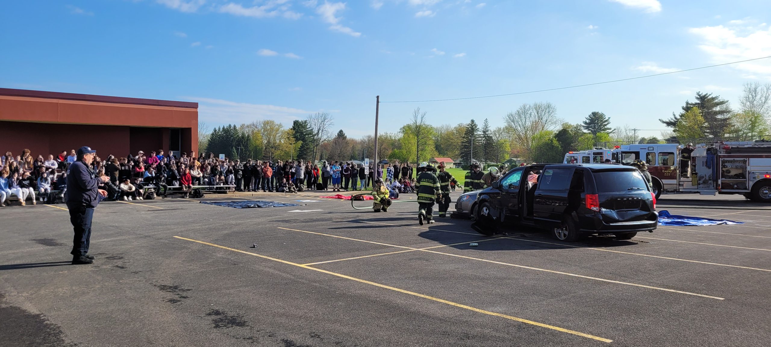 Members of the Canastota Central School District, Students Against Destructive Decisions, the Canastota Fire Department, Canastota Police Department, Wampsville Fire Department, Lincoln Fire Department, Greater Lenox Ambulance Service, and Mercy Flight organized and participated in the event. Students witnessed firsthand the efforts first responders go through to rescue victims of a car crash – from the initial fire siren to a helicopter medevac. Canastota students played the roles of the victims, including the driver who “caused” the crash and was “arrested” by police officers after a field sobriety test.