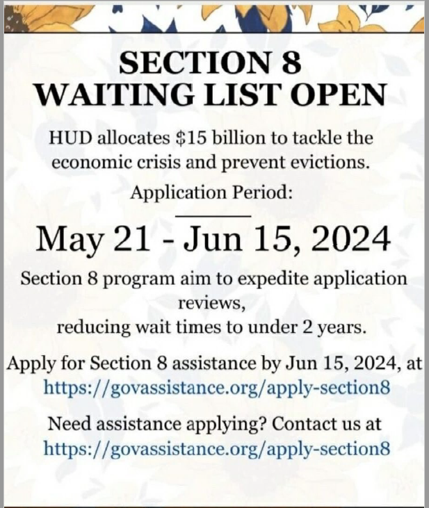 A flyer has been circulating on social media advertising assistance with applying for Section 8 funding. The flyer and website ‘www.govassistance[dot]org’ are NOT legitimate. The scam aims to take advantage of Section 8 applicants to obtain their personal information to facilitate fraudulent activity. There are multiple versions of the below advertisement on various websites including Facebook, Instagram, and TikTok, typically with slightly changed verbiage and dates.