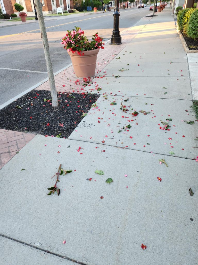On the morning of June 28, 2024 it was reported that several of the flower pots which line the streets downtown were damaged. The flowers appear to have been harmed by individuals walking by and swiping at them multiple times.