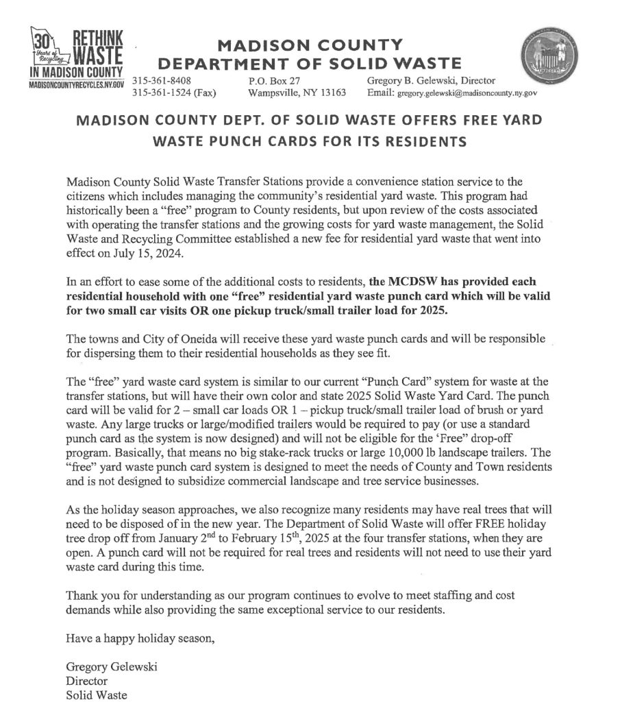 The Canastota village office (through the Town of Lenox) has a received a supply of yard waste punch cards from Madison County Solid Waste & Recycling, which can be used at the county’s transfer stations.