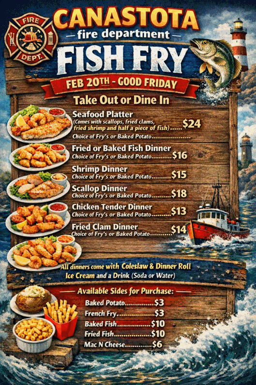 The annual Canastota Fire Department Friday Lenten Fish Fry Dinners are back! This is an important annual fundraiser for the fire company and a great way to break bread with family and friends.