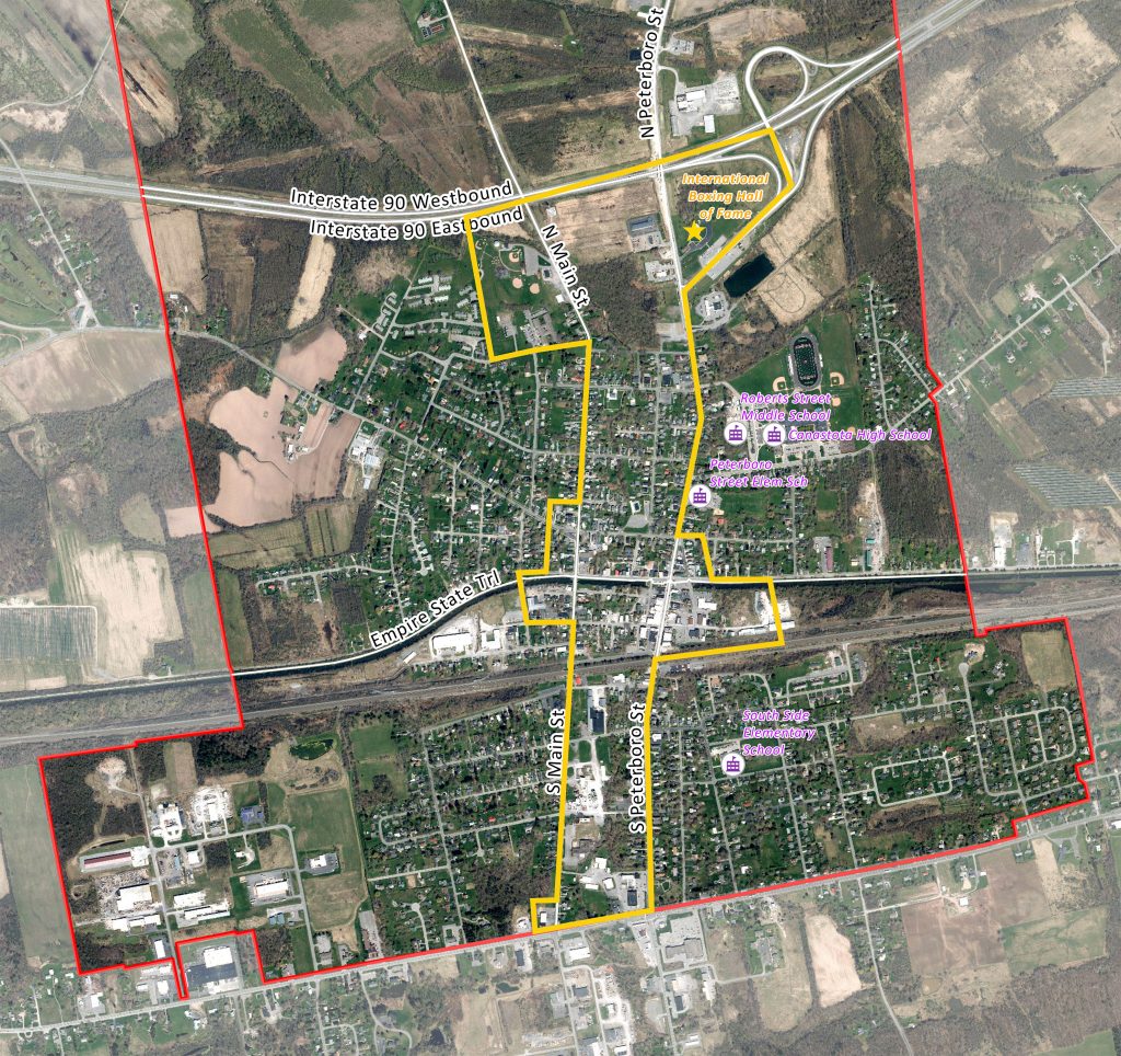 Canastota’s NY Forward focus area, highlighted in yellow below, generally extends between Peterboro Street and Main Street from the New York State Thruway (Interstate 90) to Seneca Turnpike (State Route 5). It extends slightly further east and west along the Old Erie Canal.